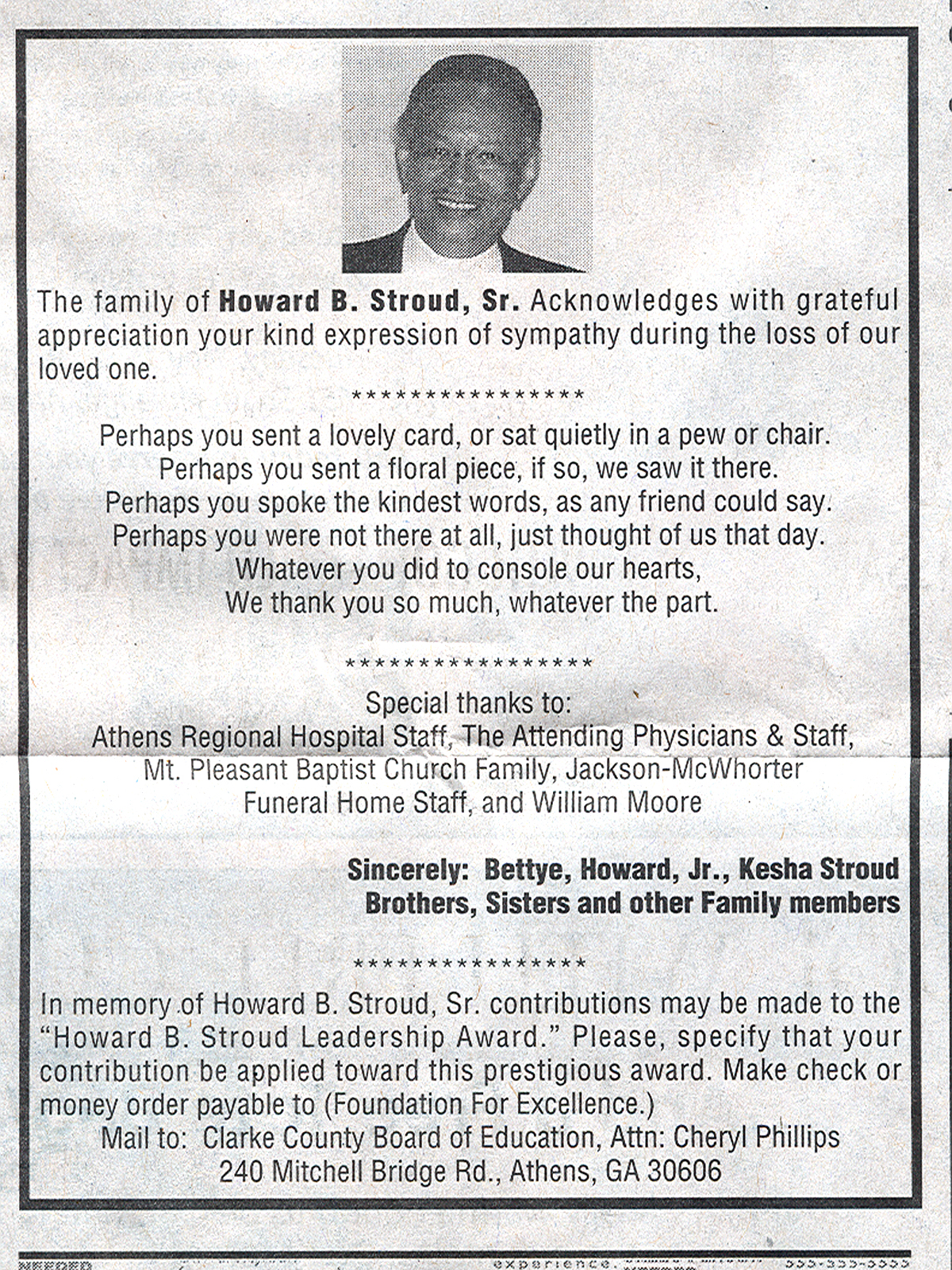 The Clarke County School District expresses it's deep and sincere appreciation to the family of Howard B. Stroud for his unselfish and outstanding service to the school district and community |